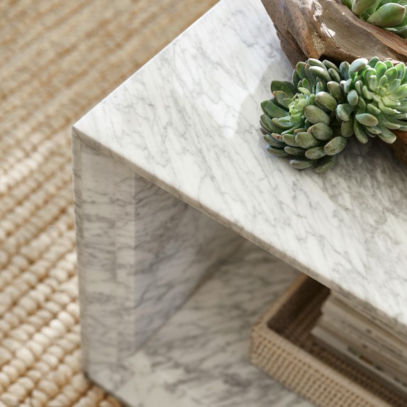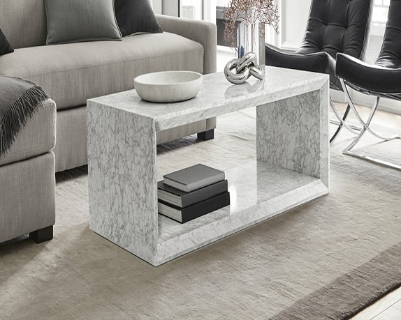 Crafted of lacquered, grey-veined white Carrara marble slabs on a durable wood frame.