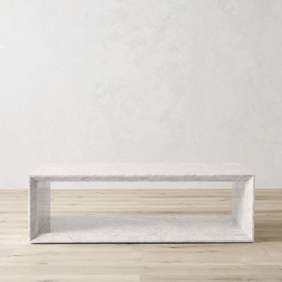Our impressive table showcases Carrara marble with all its natural texture and veining. Hand polishing and matte lacquer bring out the unique patterns in each piece of stone, while the open design offers ample storage or display.