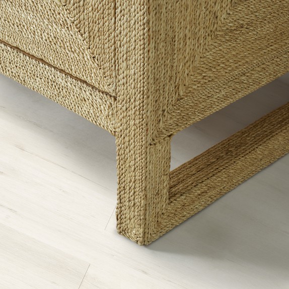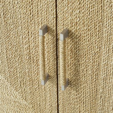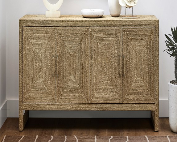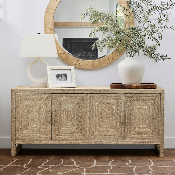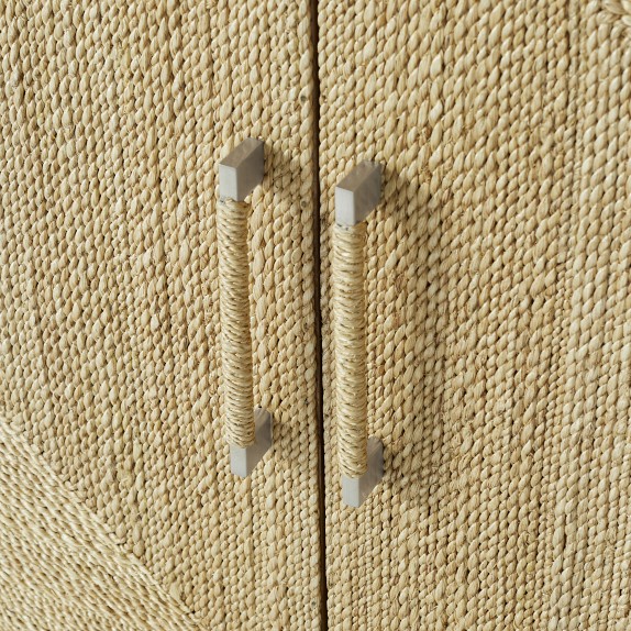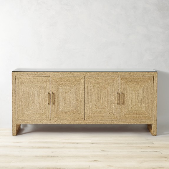The rich texture and golden tones of natural abaca imbue our Point Reyes sideboard with organic beauty and coastal style. Ideal for use as a dining sideboard or media storage, it features a glass top and double-door cabinets with adjustable shelves and wire cutouts.
