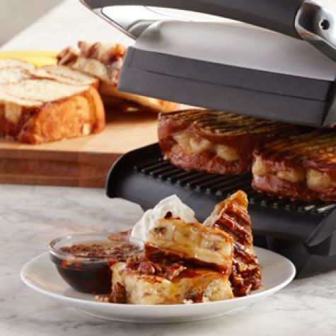 Place the bread on the panini maker and cook, adjusting the top plate so it lightly presses the bread, until browned, 4 to 5 minutes. Transfer to the rack-lined baking sheet. Soak and cook the remaining bread slices. Serve the French toast with the pecan maple syrup and whipped crème fraîche. Serves 6.