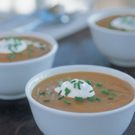 Using a blender or food processor and working in batches, process the squash mixture to a smooth puree. Return the soup to the slow cooker to keep warm until ready to serve. Adjust the seasonings with salt and white pepper. Ladle the soup into bowls, garnish each portion with a dollop of sour cream and a sprinkling of chives, and serve immediately. Serves 6 to 8.