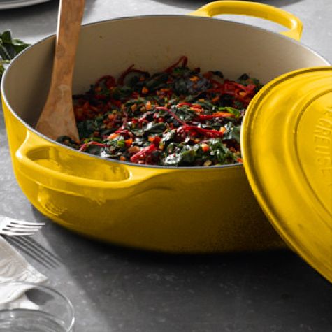 Traditionally, Moroccans would cook a hearty green like chard way down to an almost jam-like consistency. In this version, chef Mourad Lahlou takes a more Italian approach, blanching the greens and sautéing the stems. If you don’t have Urfa pepper, substitute red pepper flakes.