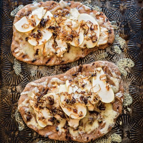 To assemble, top each flatbread with the cheese, chicken, apple slices and shallots, dividing them evenly. Bake until the cheese is melted, about 3 minutes, and serve immediately. Serves 4.