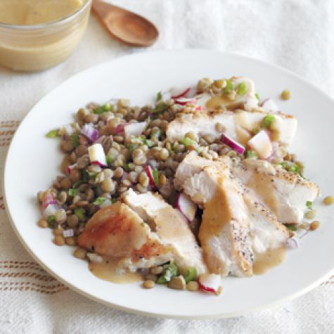 Transfer the chicken to a cutting board and cut into slices. Arrange the chicken on warmed plates and spoon the lentil salad alongside. Drizzle the chicken with the reserved dressing and serve immediately. Serves 4.