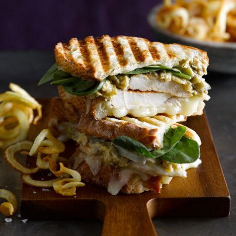 Use a panini machine to grill chicken and then press it into these hearty sandwiches, which were inspired by the classic dip pairing of spinach and artichokes. Air-Fried Curly Fries are the perfect accompaniment.
