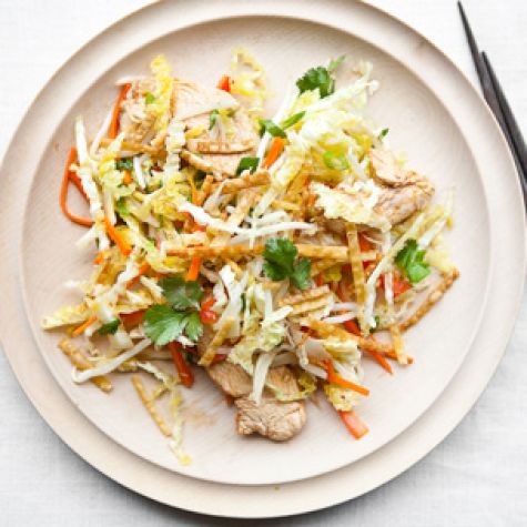 Fried wonton strips add crunch to this full-meal salad, which is chock-full of vegetables and tender pieces of chicken, all tossed with an Asian-inspired vinaigrette.
