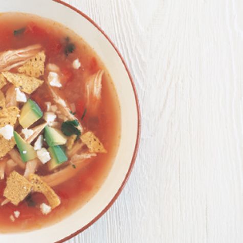 Ladle the soup into warmed bowls and garnish with tortilla chips, cheese, avocado and cilantro. Serves 4.