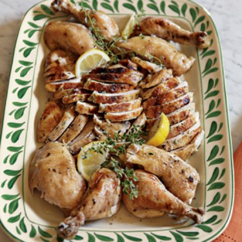 Using a mallet or a meat tenderizer, tap on the clay to break through the baked shells. Carefully remove large pieces of hot clay and brush away any small pieces. Discard the clay. Open the parchment and, using tongs, gently transfer the chickens to a cutting board. Insert an instant-read thermometer into the thickest part of the breast and thigh, away from the bone; the breast should register 160°F and the thigh, 170°F. If the chickens are not yet done, place them in a clean roasting pan or on a baking sheet and continue roasting until the correct internal temperature is reached. Carve the chickens into serving pieces and serve immediately. Serves 6 to 8.