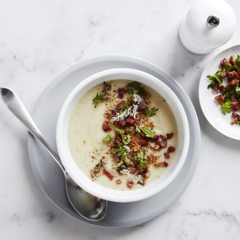 A garnish of crispy pancetta and toasted bread crumbs tossed with parsley and lemon zest transforms this creamy soup into a dish that’s fit for a special meal.