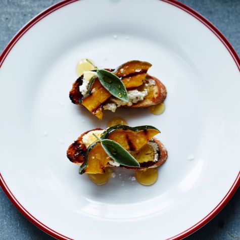 To assemble, spread 2 tsp. of the goat cheese on each baguette slice. Top with one slice of squash and drizzle lightly with honey. Garnish with a sage leaf, season with salt and pepper and serve. Serves 6 to 8.