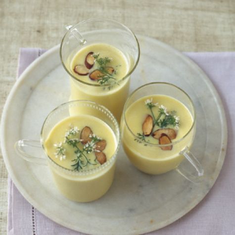 Meanwhile, prepare a large bowl of ice water. Transfer half of the soup to a blender, add half of the yogurt and blend until smooth. Pour the soup through a fine-mesh sieve into a bowl. Puree the remaining soup and yogurt and pour through the sieve into the bowl. Nestle the bowl of soup in the ice water, stirring occasionally, until cool. Once cool, cover and refrigerate until ready to serve. To serve, ladle the soup into chilled cups and garnish with the almonds and cilantro. Serves 8.