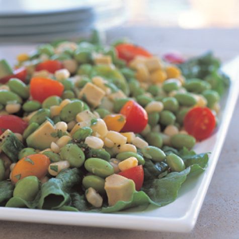 Bring a saucepan of water to a boil over high heat. Have ready a bowl of ice water. Add the corn and the edamame to the boiling water and cook for 3 minutes. Using a slotted spoon, transfer to the bowl of ice water. Drain the corn and edamame, place in a large bowl, and add the tomatoes and avocado.