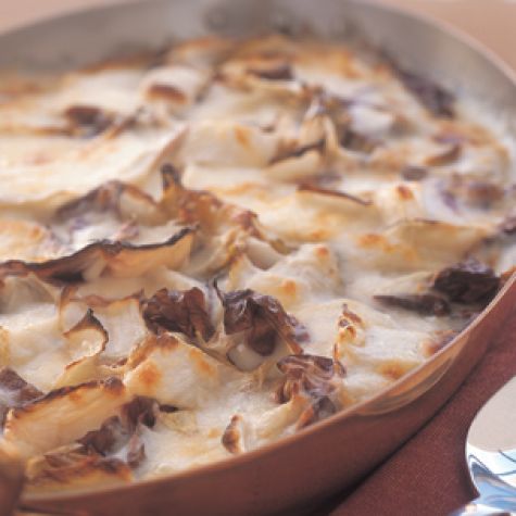 Preheat an oven to 400°F. Butter a shallow 2-quart gratin or baking dish. Put the endive and radicchio in the prepared dish and toss to combine.
