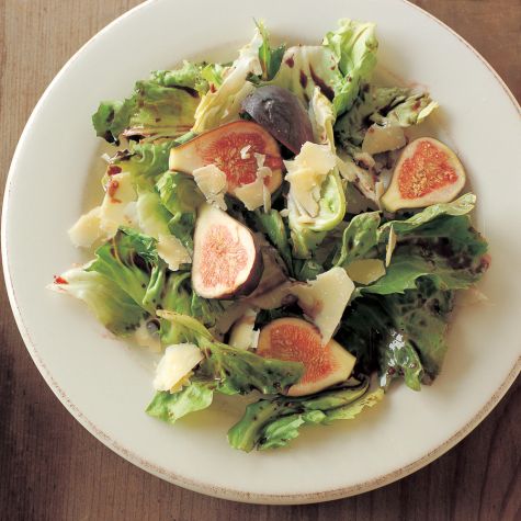 Divide the escarole among 4 to 6 plates and top each serving with 4 or 5 fig halves. Using a vegetable peeler, shave the cheese over the salads, dividing it evenly. Drizzle each salad with some of the remaining dressing and serve immediately. Serves 4 to 6.