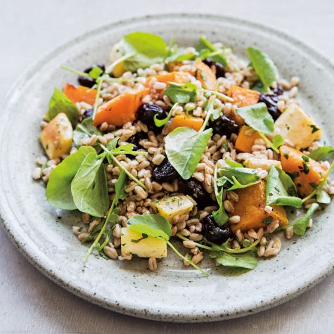 Farro is an Italian whole grain rich in tension-relieving magnesium. It adds a nutty crunch that complements soft-roasted root vegetables. Watercress gets its peppery zing from rich sulfur compounds, which help rid toxins from the body. Serve this grain-based salad warm or at room temperature.