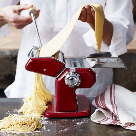 Attach a pasta cutter to the pasta machine according to the manufacturer’s instructions and cut the pasta into the desired shape. Transfer the pasta to a baking sheet lightly dusted with flour to prevent sticking. Makes about 1 1/4 lb. (625 g) dough.