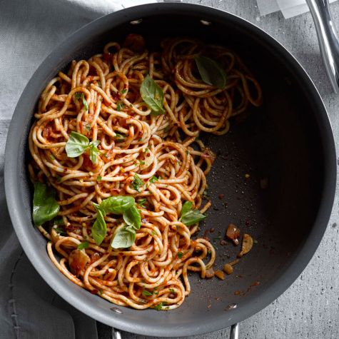 Arrabbiata means “angry” in Italian, which makes it a fitting name for this potent pasta dish that gets its kick from a tomato sauce spiked with our fiery Calabrian chiles. If you start the sauce while a Philips pasta maker is mixing and kneading the pasta, you’ll have dinner on the table in no time at all.