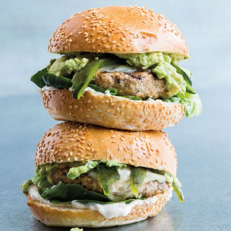 Spread the bottom bun with mayonnaise and top with a lettuce leaf. Set the burgers on the buns and top with the roasted chiles and a dollop of the avocado. Close the burgers and serve immediately. Serves 4.