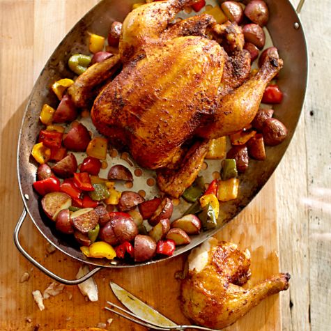 Transfer the chickens to a carving board, cover loosely with aluminum foil and let rest for 10 minutes. Transfer the potatoes and peppers to a platter. Carve the chickens, arrange on the platter and serve immediately. Serves 8.