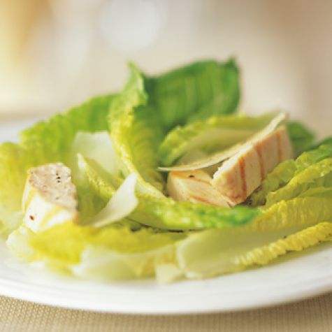 Meanwhile, in a large bowl, combine the lettuce and dressing and toss to coat evenly. Arrange the lettuce on individual plates, top with the chicken slices and cheese and serve immediately. Serves 4.