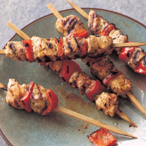 Remove the chicken from the marinade and discard the marinade. Thread 4 chicken pieces, alternating with 3 bell pepper pieces, onto each skewer. Place the skewers on the grill, cover the grill and cook, turning the skewers occasionally, until the chicken feels firm when pressed with a fingertip, 10 to 12 minutes total.