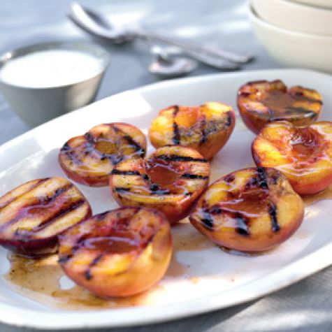 Fresh take: Other fruits, such as nectarines, apricots and pluots, are good candidates for this summertime grilled dessert, too. You can also grill the fruits, minus the honey-brandy dunk, and then chop them and add to a green salad. Arugula is good match for the caramelized flavors of the fruit.