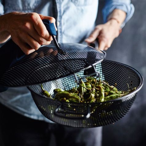 Appetizers don’t get much easier than these grilled shishito peppers, which are simply tossed with olive oil before being grilled over high heat using a mesh grill pan. We like to use Maldon salt for its exceptional mineral flavor and coarse texture, but you can use any type of coarse sea salt you have on hand. This dish is also great made using Spanish padrón peppers, which have a similar flavor and texture.