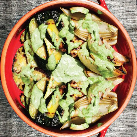 Working in batches and starting with the fennel and onion, grill the vegetables directly over the heat, rotating them after a few minutes to get attractive hash marks. Flip them over and place them on the cooler side of the grill. Repeat the same process with the zucchini and eggplant, in each case cooking until they’re just tender.
