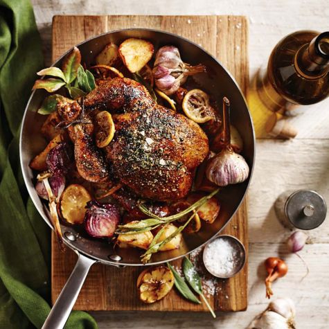 Place the chicken, breast side up, in a sauté or fry pan and add the remaining lemons halves, garlic heads and red onions to the pan and drizzle with the olive oil. Roast the chicken until the skin is well browned and an instant-read thermometer inserted into the thickest part of the thigh, away from the bone, registers 170°F (77°C), 50 to 60 minutes.