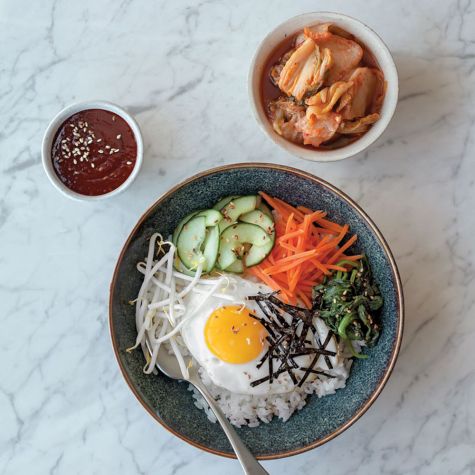 Divide the rice among 4 large bowls. Place small mounds of the cucumber, carrots, spinach and sprouts around the rice. Place an egg in the center of each bowl. Sprinkle with the nori strips. Pass the kimchi and hot sauce at the table. Serves 4.