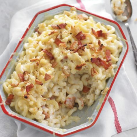 Here’s a seriously grown-up version of a kid’s classic. Thanks to their different ages, the two cheddars give this hearty baked pasta a richness that’s balanced by the addition of salty, smoky bacon. A scattering of toasted coarse bread crumbs provides a crunchy, crusty top layer.