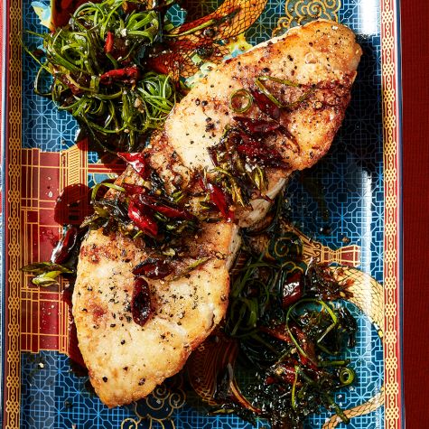 Prized for its rich, buttery flavour and tender texture, Chilean sea bass takes well to bold seasonings and sauces. Here chef Melissa King, an entrepreneur, activist and winner on Top Chef, pairs the fish with a flavour-packed sauce that includes two types of soy sauce, fresh ginger, garlic and mildly spicy Sichuan chiles. She chose this dish to serve during Lunar New Year, “a time to celebrate and gather with your loved ones over a large spread of food,” says the chef.