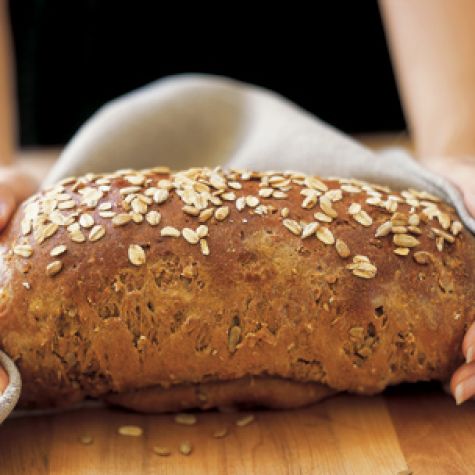 In a small bowl, lightly beat the egg white. Remove the plastic wrap and brush the top of the loaf with the egg white. Sprinkle the remaining 1 Tbs. each rolled oats and sunflower seeds evenly over the top. Bake the bread until the top is golden and the bottom sounds hollow when tapped, 40 to 45 minutes. Let cool in the pan for 5 minutes, then turn out onto a wire rack and let cool completely. The loaf can be cut into 16 slices. Serves 16.