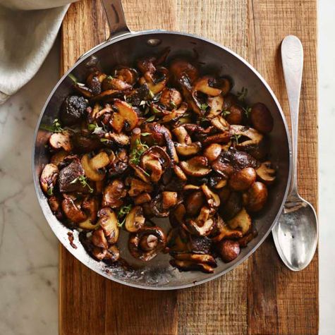 Add the sherry to the mushrooms and deglaze the pan, stirring with a wooden spoon to remove any browned bits from the pan bottom. Return the shallots to the pan and add the thyme. Cook, stirring, until the sherry is almost evaporated, 1 to 2 minutes. Add the butter and cook until the butter has melted and glazes the mushrooms, about 1 minute more. Season with salt and pepper to taste and serve immediately. Serves 4.