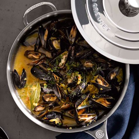 If you want to prepare a sophisticated meal in almost no time at all, you can’t beat mussels, which are a crowd pleaser when cooked simply with wine and shallots, as in the French classic known as moules marinière. Here, we take that iconic Gallic dish and give it a little twist (and a hint of color) with saffron, but you can omit it if you prefer. Be sure to discard any mussels that are open when raw (unless they close when you tap them on your work surface), and then discard any that remain closed once they have been cooked.