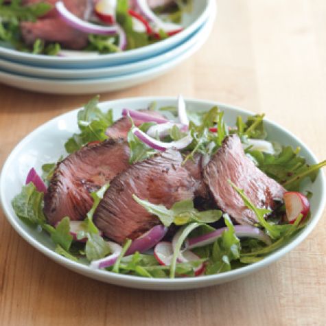 Divide the arugula among 4 warmed plates and top with the onion and radishes. Squeeze lemon juice over the salads. Slice the steak thinly on an angle and arrange on top of the arugula. Drizzle with the glaze and serve immediately. Serves 4.