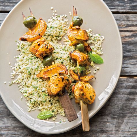 Divide the couscous among warmed individual plates. Divide the skewers among the plates and serve immediately. Serves 6.