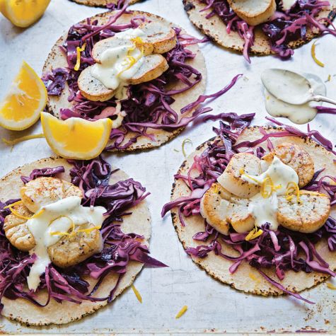To assemble, fill each tortilla with 2 scallops or 4 scallop halves and top with a handful of the cabbage and a generous drizzle of the aioli. Serve immediately. Serves 4.