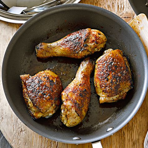 In a nonstick fry pan over medium-high heat, warm the oil. Add the chicken, reduce the heat to medium, cover and cook, turning the pieces occasionally, until an instant-read thermometer inserted into the thickest part of a thigh, away from the bone, registers 170°F (77°C), 15 to 17 minutes.