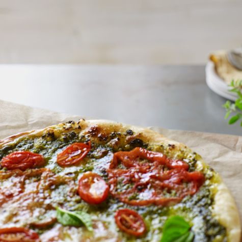A food processor makes fast work of preparing the pizza dough as well as the basil pesto. Spread some of the pesto on the pizza before baking, then drizzle on the rest just before serving to add fresh flavor and a bright green color.
