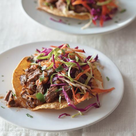 Start these tostadas around lunchtime and by dinner you’ll have a slow cooker full of tender, succulent beef to prepare these colorful tostadas. If you’d rather not take the time to make the veggie slaw, you can top the tostadas with plain shredded cabbage instead.