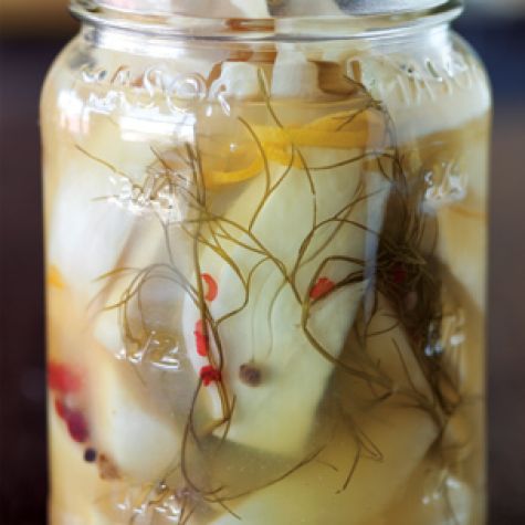 Bright and bracing, pickled fennel can be enjoyed just a day after it is canned. The orange zest and juice and the mirin highlight the vegetable’s sweet anise flavor. The fronds look attractive in the jars and on a serving plate alongside the fennel slices. Pair with fresh goat cheese.