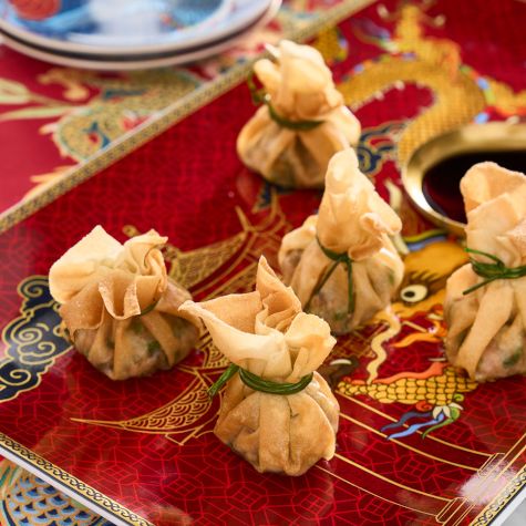 Tied up with a length of green onion, these “golden bag” dumplings from Kristina Cho, author of the award-winning cookbook Mooncakes & Milk Bread, look like little presents—what better way to celebrate the Lunar New Year? She explains that for the filling you should look for Chinese garlic chives, which are different from the chives you find in most American markets. Chinese garlic chives are less intense in flavor, but if you can’t find them, finely chopped green onions will also work (don’t substitute regular chives, which will make the flavor too sharp). Also, when choosing green onions to tie up the parcels, look for thin, tender ones that will be flexible enough to tie into a knot.