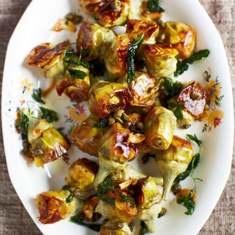 Arrange the artichokes on a plate and spoon the capers, oil and slightly crispy mint on top. Serve immediately or at room temperature. Serves 4 to 6.