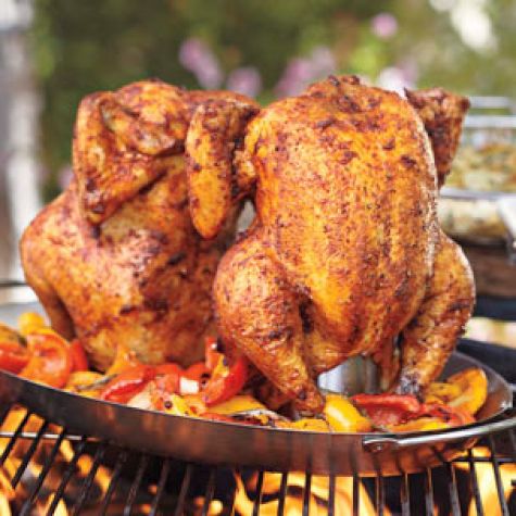 Transfer the chickens to a carving board, cover loosely with aluminum foil and let rest for 10 minutes before carving. Carve the chickens and serve with the bell peppers. Serves 8.
