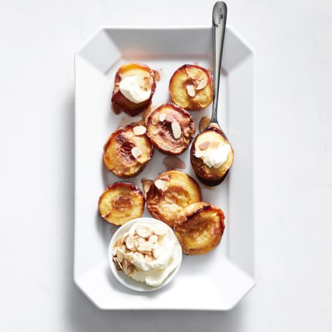 Transfer the peaches to a large baking dish and roast until golden brown and the edges are slightly charred, about 25 minutes, stirring once. Let cool for 10 minutes. Using a slotted spoon, transfer the peaches to a platter, reserving the juices in the pan.
