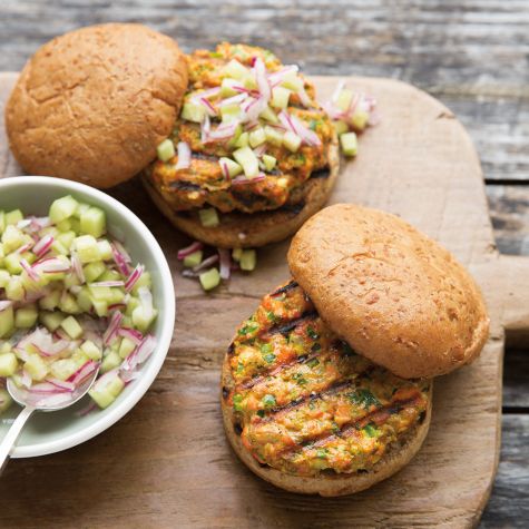 Salmon Satay Burgers with Cucumber-Onion Relish