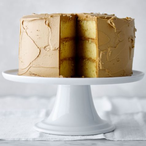 How do you make a three-layer yellow cake even more festive? By slathering it with a buttercream frosting infused with delicious salted caramel. The recipe make more salted caramel than you will need, but the leftovers will keep in the fridge for a few weeks. Gently reheated, it’s marvelous drizzled on ice cream or fresh fruit. If you like, you can garnish the cake with a light sprinkling of a large-flake finishing salt.