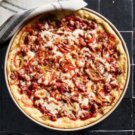 This deep-dish pizza will satisfy a hungry crowd. You can prepare the dough and assemble the pie in advance, then pop it in the oven and welcome your guests with the enticing aroma of fresh-baked pizza. Toss a simple green salad, pour some red wine and dinner is served.