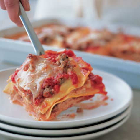 On the bottom of a 10-by-12-by-2-inch baking dish, spread about 1/4 cup of the tomato-basil sauce. Cover with a single layer of lasagna noodles without overlapping them. Spread the noodles with one-third of the remaining sauce, followed by half of the ricotta mixture and one-third of the sausage. Add another layer of noodles and top with one-third of the sauce, the remaining ricotta mixture and one-third of the sausage. Top with another layer of noodles and the remaining sauce and sausage and then cover with an even layer of mozzarella and Parmigiano-Reggiano.